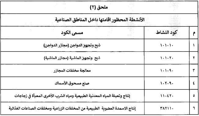 وأوضح الوزير أن القرار ينص على حظر إقامة أو إدارة أو تشغيل الأنشطة الصناعية خارج المناطق الصناعية على أن يُستثنى من ذلك الأنشطة الصناعية داخل الأحوزة العمرانية أو الكتل المبنية المعتمدة وفقاً للقوانين المعمول بها المدرجة بالملحق رقم 1 المرفق بالقرار، كما تُستثنى الأنشطة الصناعية خارج الأحوزة العمرانية التي تتطلب بحسب طبيعتها والمقومات اللازمة لتشغيلها التواجد خارج الحيز العمراني بشرط موافقة الجهة الإدارية المختصة وتوافر الاشتراطات اللازمة لممارسة النشاط الصناعي، وذلك وفقا لما تحدده الهيئة العامة للتنمية الصناعية، كما يحظر القرار إقامة أو إدارة أو تشغيل أي من الأنشطة الصناعية المدرجة بالملحق رقم ۲ المرفق بهذا القرار داخل المناطق الصناعية.